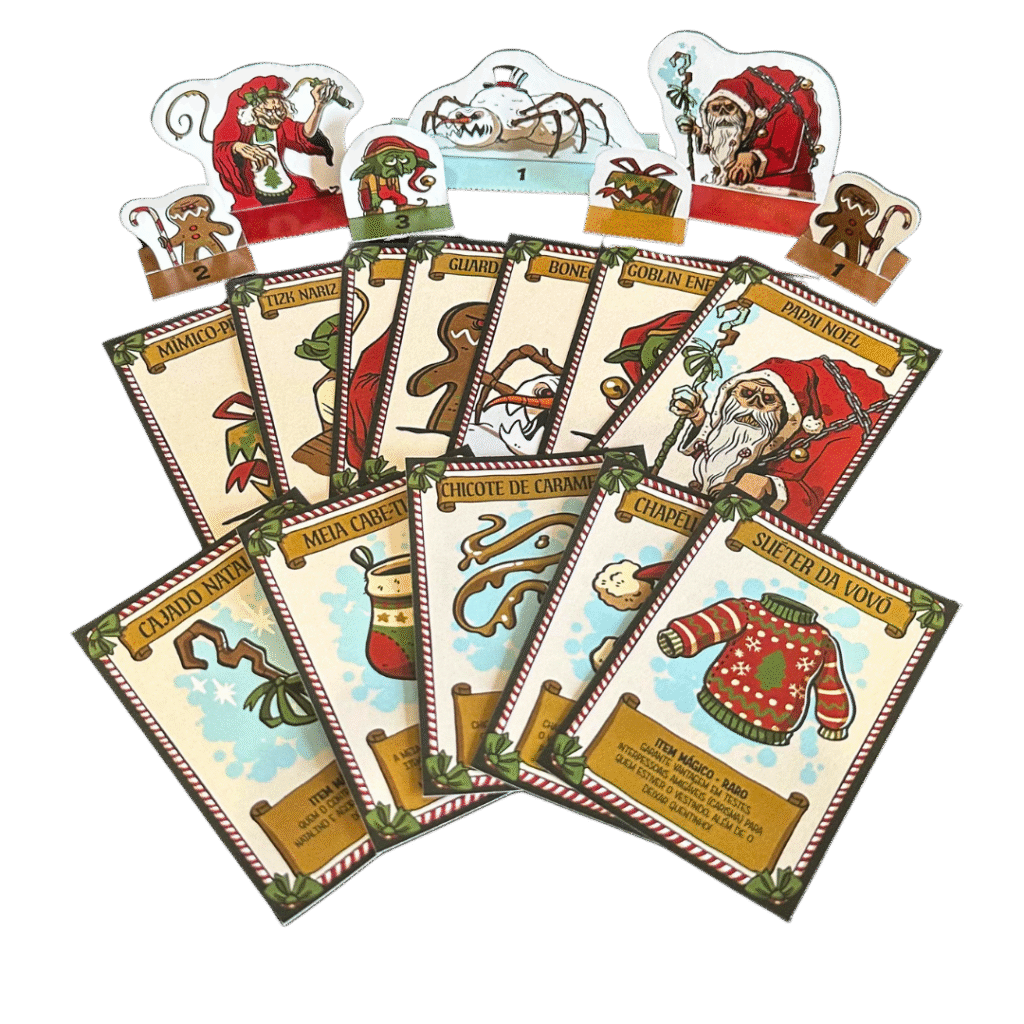 Cartas de itens mágicos, cartas de NPCs e miniaturas de papel para completar sua aventura natalina